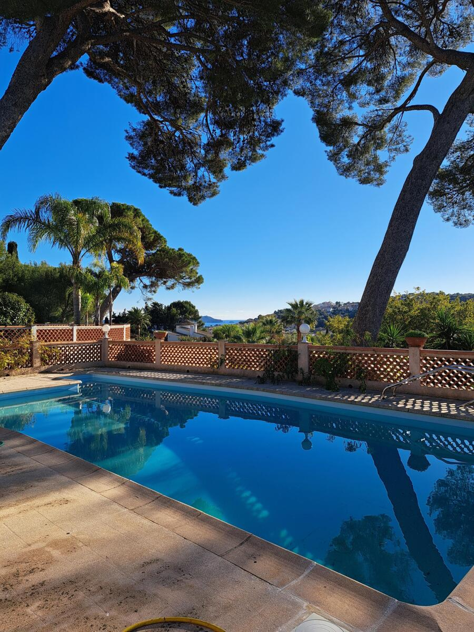 Très belle villa familiale de 150m2 sur un beau terrain de 1296 m2 à la vue dégagée et au petit aperçu mer. Cette propriété propose une belle entrée avec grand placard qui dessert 2 spacieuses chambres (dont une avec placard), une salle récente et des toilettes indépendants. Une grande cuisine indépendante pourvue d’un cellier donne sur une agréable terrasse exposée Est. Le spacieux séjour lumineux quant à lui donne accès à une large terrasse couverte qui surplombe la majestueuse piscine et son aperçu mer. A l’étage, 2 chambres pourvues de placard (l’une d’elle avec un dressing supplémentaire), ont accès à une véranda qui offre un espace de vie supplémentaire à la belle vue dégagée sur les collines environnantes. Cet étage est complété par une grande salle de bains et des toilettes indépendants. Un immense garage automatisé avec mezzanine, accède directement au 1er niveau de la maison ce qui offre un confort supplémentaire non négligeable. Cette villa, à laquelle il conviendra peut-être de redonner un petit coup de jeune, est d’une construction irréprochable, a toujours été parfaitement entretenue et offre des possibilités de réagencement faciles si nécessaire pour la rendre un peu plus moderne. Un cocon à visiter sans tarder parfait pour les amoureux des belles maisons traditionnelles respirant la sérénité et la douceur de vivre!